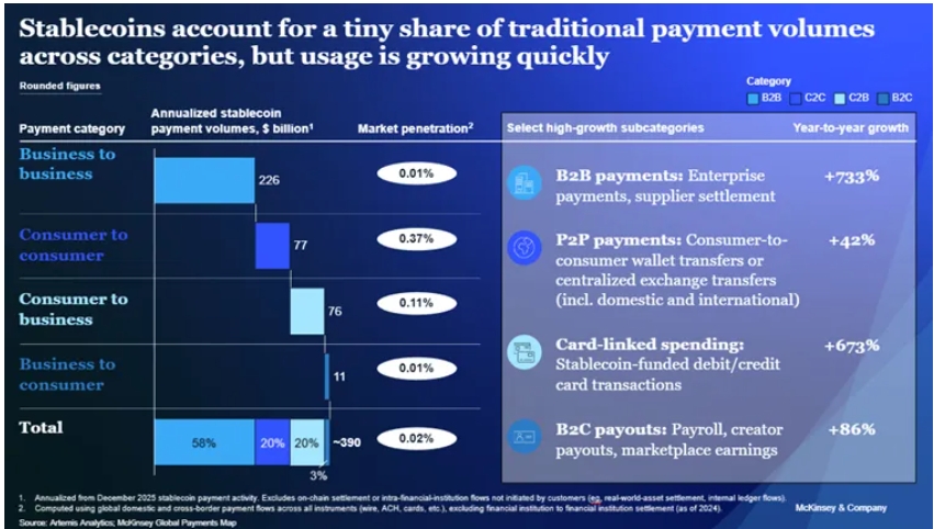 (Big Ideas 2026:区块链在未来趋势中的定位) 然而,这些交易活动大多并非真正的终端用户支付,例如向供应商付款或汇款。它们主要包括交易、内部资金转移和自动化区块链活动。 为了排除干扰因素,更准确地评估稳定币支付量,麦肯锡与领先的区块链分析提供商 Artemis Analytics 合作。分析结果表明: 按目前的交易速度计算(年化数字基于 2025 年 12 月的稳定币支付活动),每年实际的稳定币支付量约为 3900 亿美元,约占全球支付总量的 0.02%。 这凸显了对区块链上记录的数据进行更细致解读的必要性,以及金融机构需要进行以应用场景为导向的战略性投资,才能实现稳定币的长期潜力。
