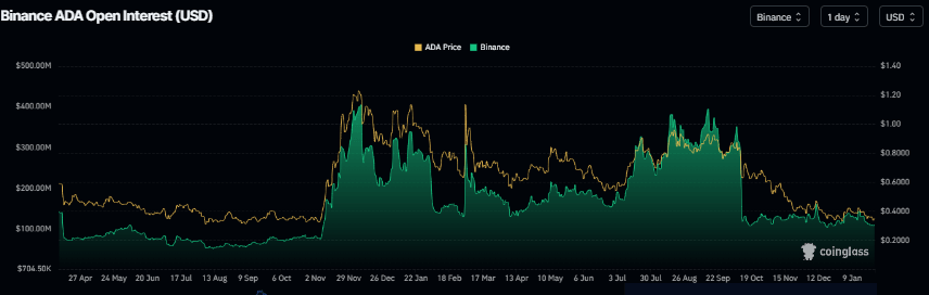 根据 Coinglass 的数据,Cardano 在币安交易所的期货未平仓合约 (OI) 周日降至 1.0855 亿美元,为 12 月 25 日以来的最低水平。OI 的下降反映出投资者参与度的减弱,预示着看跌的前景。