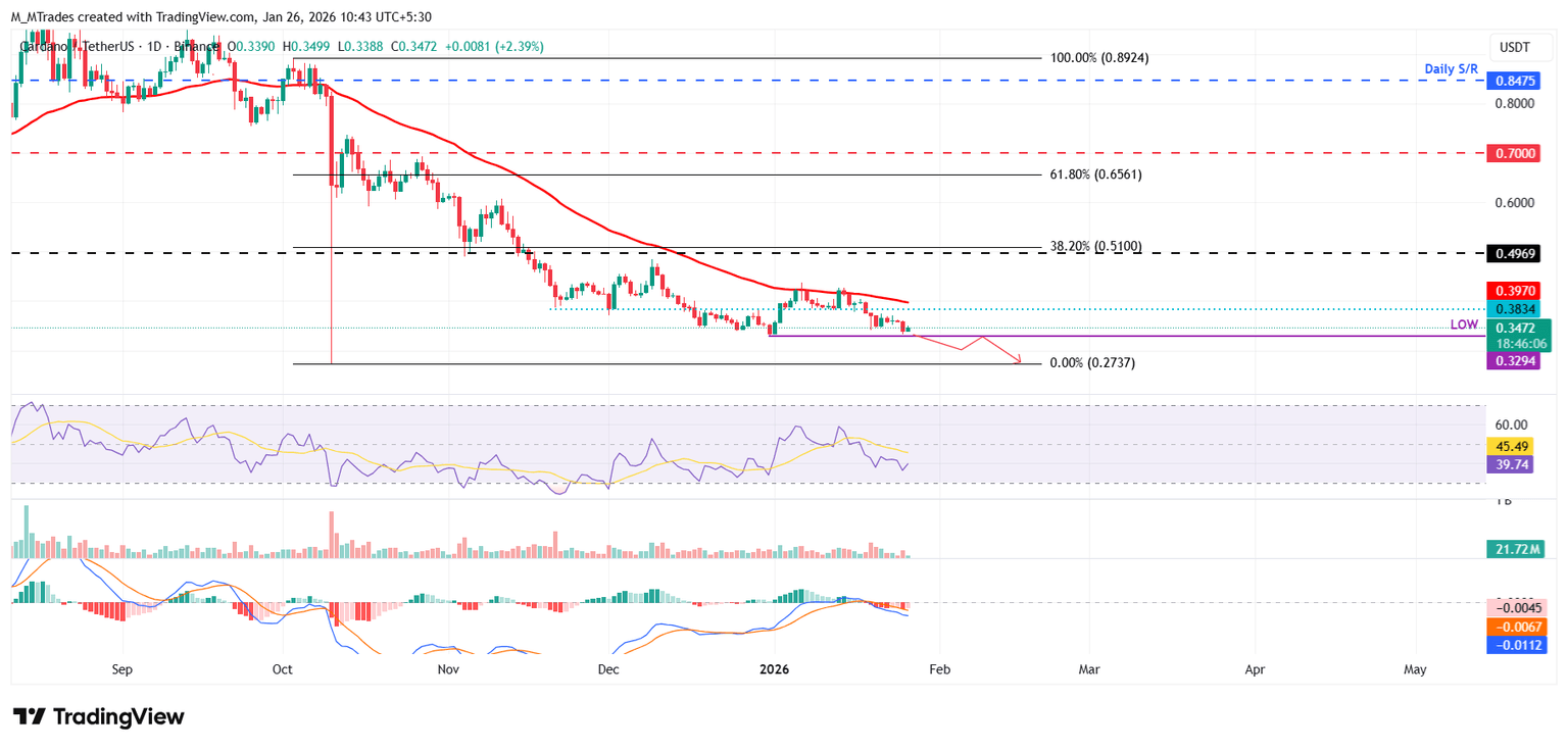 卡尔达诺截至周一发稿时,ADA(阿达木单)价格在0.34美元附近徘徊,此前自1月初以来已连续三周回调。未平仓合约(OI)的下降进一步印证了当前的回调趋势,表明投资者参与度正在减弱。从技术面来看,空头占据主导地位,暗示价格可能进一步下探至0.27美元。
