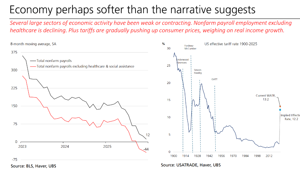 据追风交易台,瑞银在1月23日的报告中指出,尽管总体经济数据看似强劲,但增长来源极其狭窄。除AI和科技板块外,大部分实体经济处于疲软甚至收缩状态。劳动力市场的扩张已经显著放缓,除去医疗保健行业的“繁荣”,就业实际上是在萎缩。