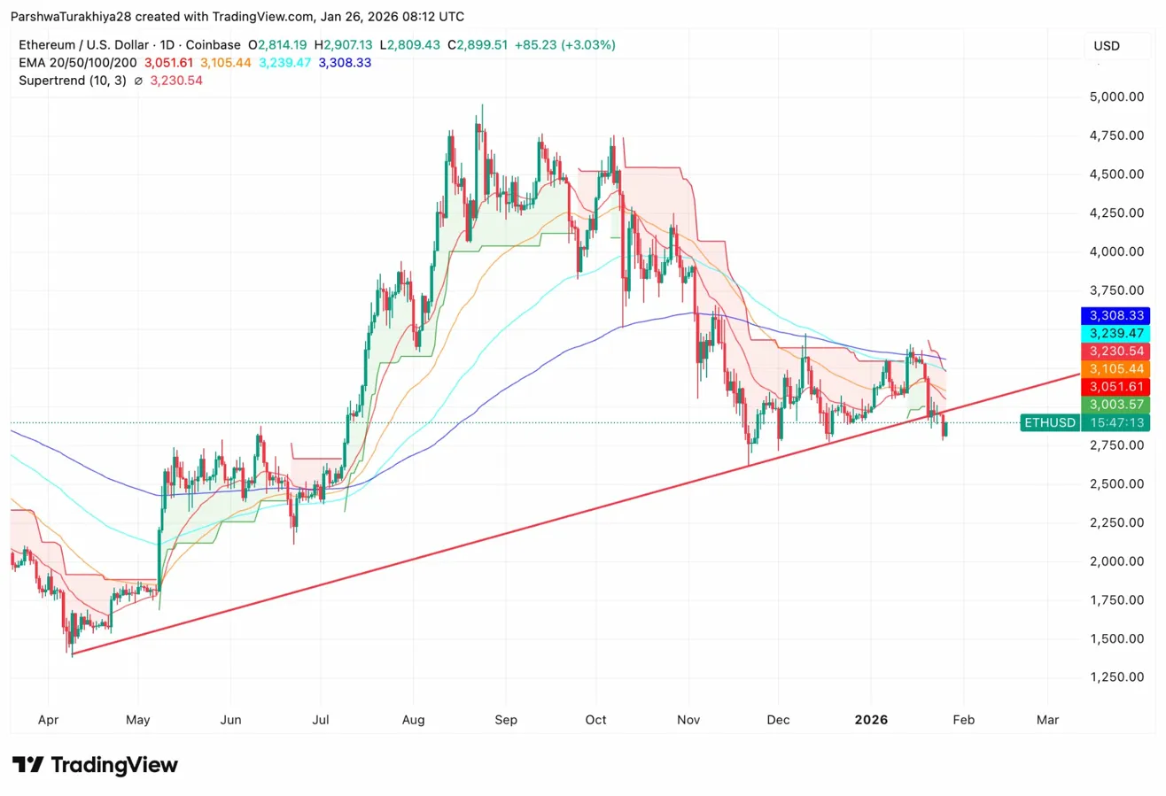 以太坊价格今日在 2899.51 美元附近交易,此前价格从一条持续数月的上升趋势线反弹,该趋势线自 4 月以来一直支撑着价格回升。此次反弹正值网络活动达到前所未有的水平之际,日交易量创下历史新高,这与价格的下跌走势形成鲜明对比。