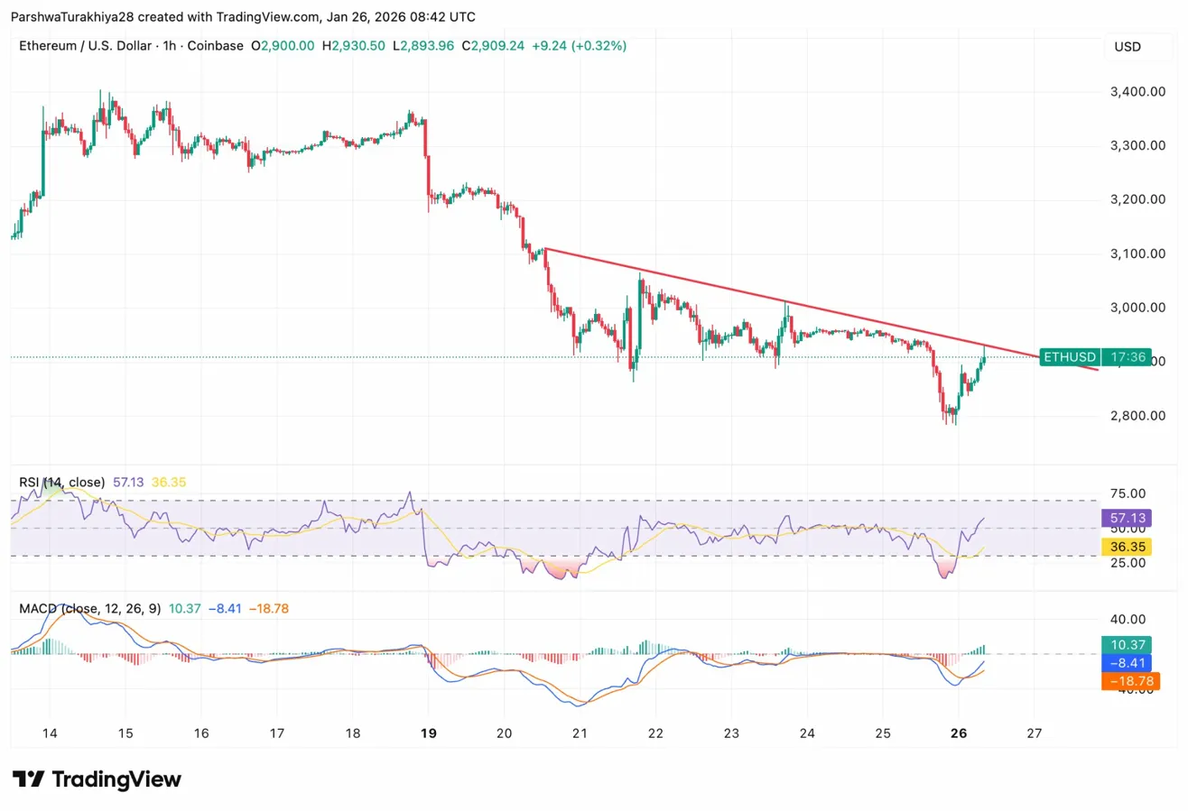 较短时间周期显示市场状况正在改善。在小时图上,以太坊价格已从 2800 美元的低点反弹,并突破了自 1 月 19 日以来限制其上涨的下降趋势线。