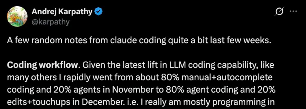 去年11月,大约是80%手动 自动补全编码,20%使用智能体。到了12月,这个比例颠倒了过来,变成了80%由智能体编码,AK只做20%的编辑和修补工作。