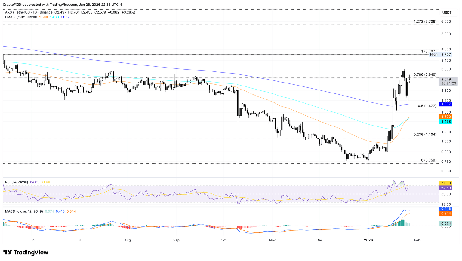 AXS应该能突破78.6%的关口斐波那契从 5 月 14 日的高点 3.707 美元到 12 月 17 日的低点 0.759 美元,计算得出价位在 2.640 美元附近,使 3.707 美元重新回到人们的视野中。