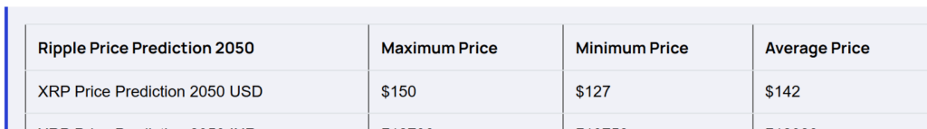 此外,XRP 的最大供应量有限(100,000,000,000 XRP),这也使其比其他供应量无限的加密货币更具优势。分析这些因素后,我们预测 XRP 在 2050 年的美元价格为:最高 150 美元,最低 127 美元,平均 142 美元。
