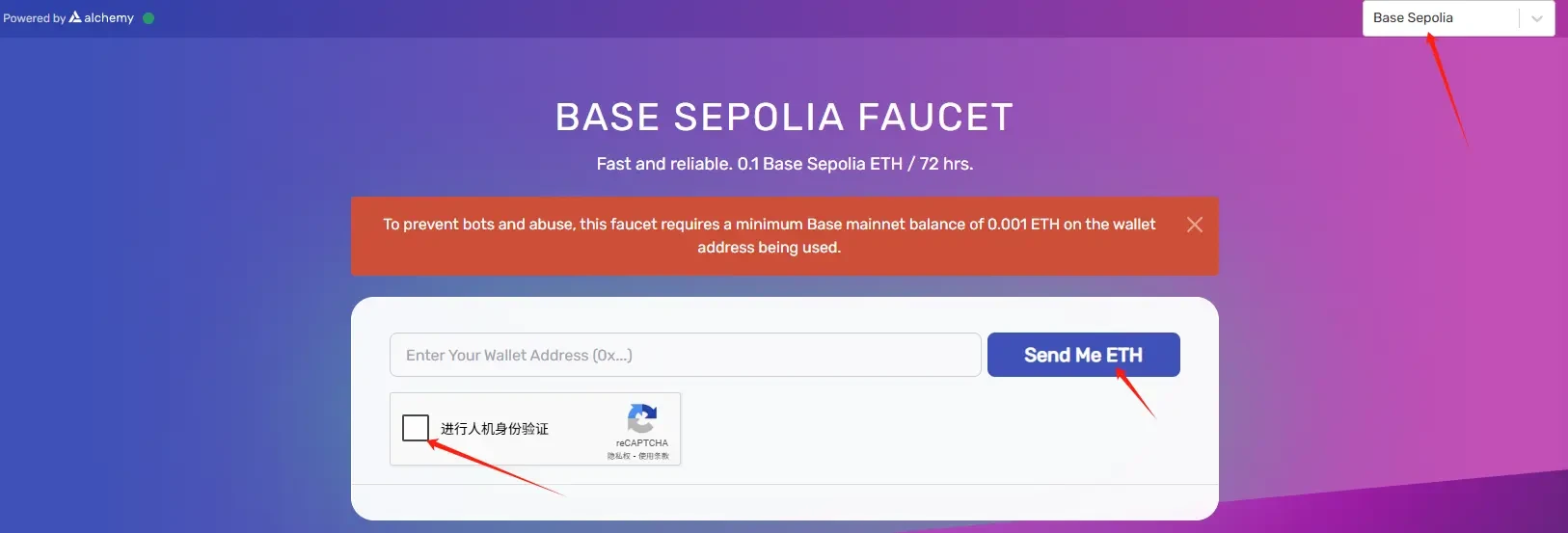 STEP 1. 进入领测试币网站(链接:https://www.alchemy.com/faucets/base-sepolia),选择“Base Sepolia”测试网络,完成人机认证后输入地址领取测试币 ETH( 需要钱包在 Base 主网有 0.001 ETH 才能领取)。