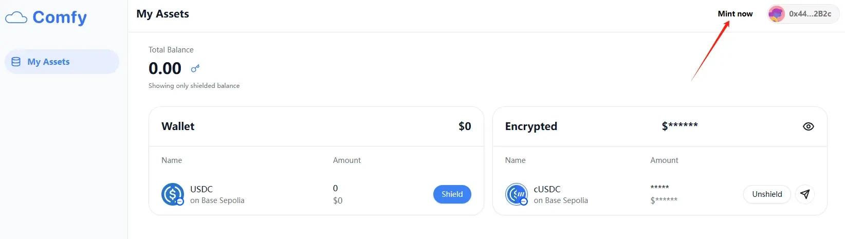 STEP 3. 进入 Comfy 项目交互网站(连接:https://comfy.inco.org/)后,点击“Connect Wallet”后选择“Mint now”去 Mint USDC。