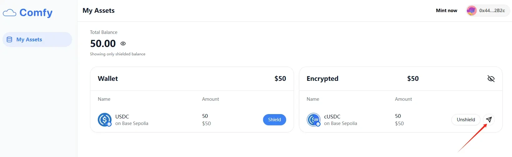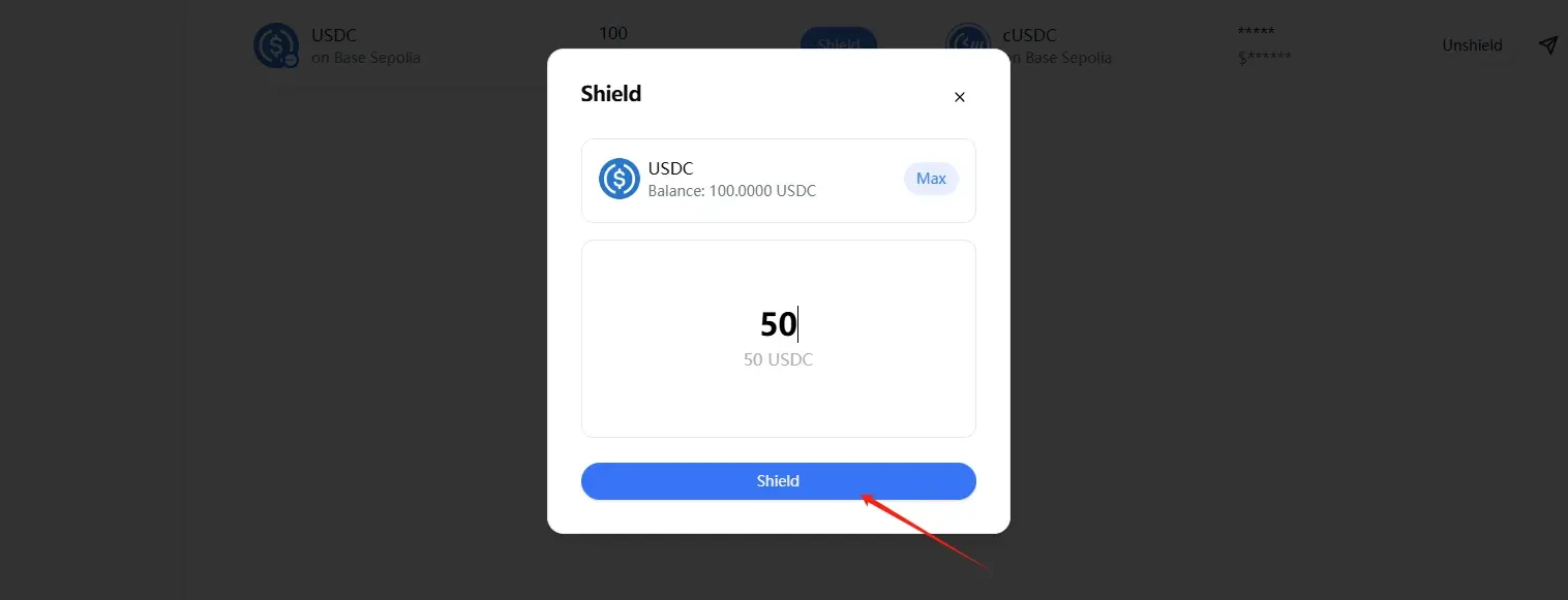 STEP 4. 选择“Shield”将一部分 USDC 兑换成 cUSDC,再点击“Unshield”将部分 cUSDC 兑换为 USDC。