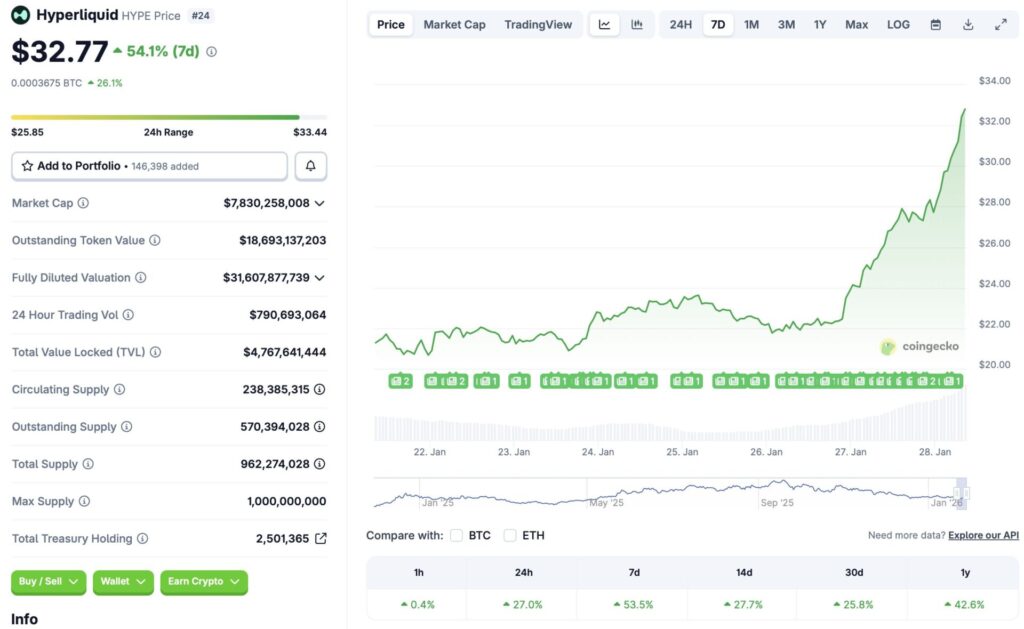 Hyperliquid 的 HYPE 代币目前是市场上表现最佳的加密货币之一,全面上涨。尽管市场整体处于熊市,HYPE 的价格在所有时间框架内均保持上涨趋势。根据 CoinGecko 的数据,HYPE 在过去 24 小时内上涨了 27%。过去一周上涨 53.5%,过去 14 天上涨 27.7%,过去一个月上涨 25.8%,自 2025 年 1 月以来上涨 42.6%。让我们来探讨一下为什么 HYPE 处于上涨区间,而其他资产却难以获得增长动力。