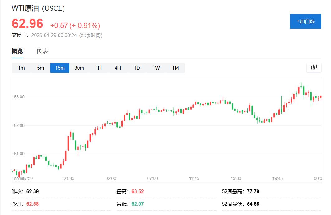 特朗普发帖后,国际原油期货加速上涨。美股盘前刷新日高时,美国WTI原油期货涨至63.52美元,日内涨逾1.8%,布伦特原油涨至68.53美元,日内涨逾1.4%,均刷新2025年9月末以来盘中高位。