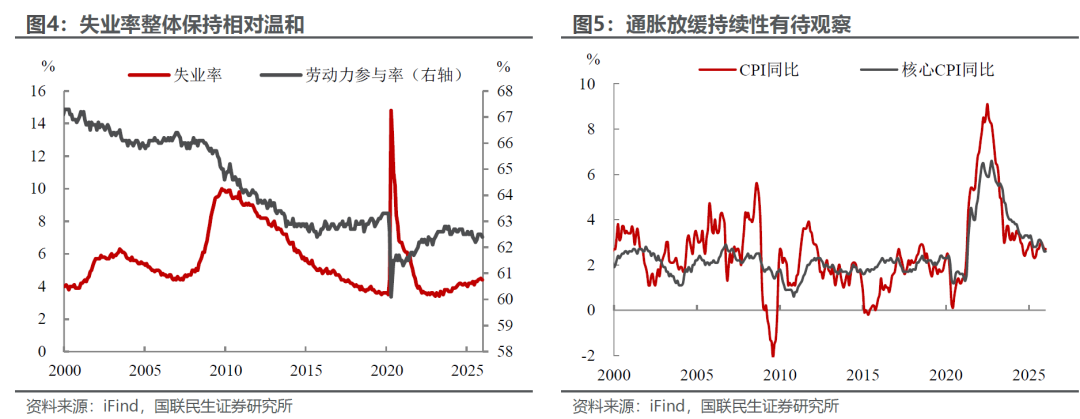 从经济基本面来看,就业韧性与通胀预期形成微妙平衡,构成了暂缓降息的核心经济逻辑支撑。劳动力市场呈现“弱而不垮”的特征,失业率上行幅度有限,就业增速放缓但未出现加速恶化迹象;核心CPI虽回落至2.6%,但仍高于2%政策目标,住房、医疗等服务类价格黏性犹存,而且关税对商品价格的传导依然是当前美联储的隐忧,因此等待通胀放缓趋势进一步确认无疑是更为理性的政策选择。
