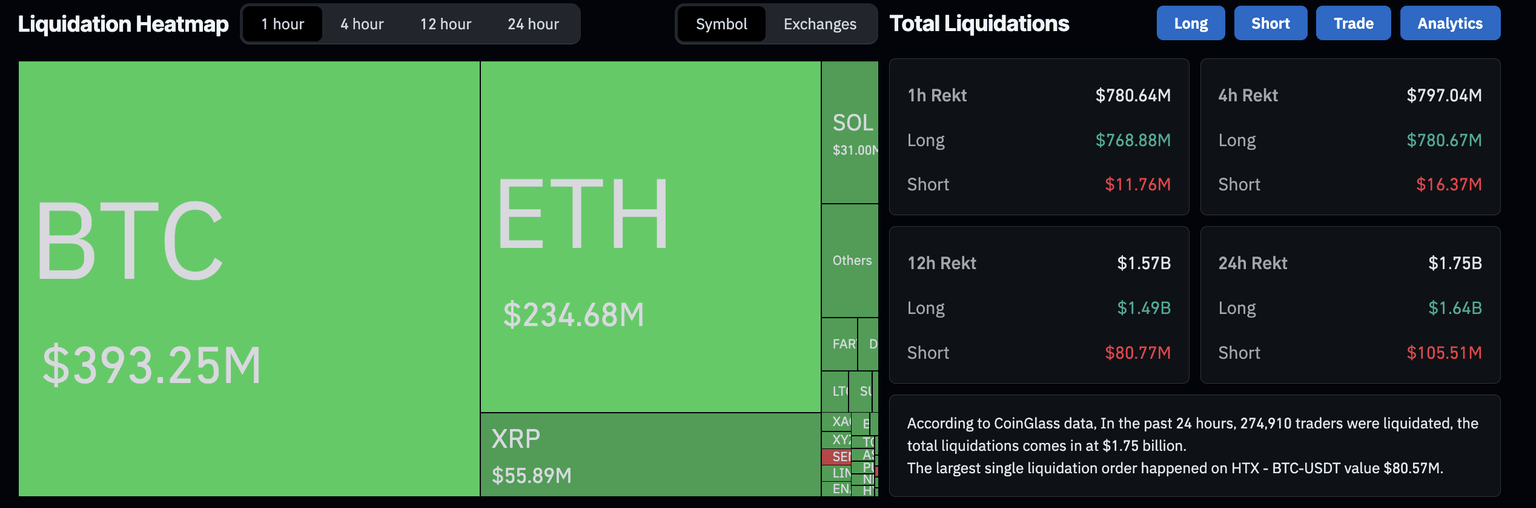 在更广泛的加密货币市场中,比特币的突然回调引发了熊市浪潮,导致过去24小时内274,910名交易者遭遇超过17.5亿美元的清算,其中包括超过16.4亿美元的多头清算。最大的清算事件发生在HTX交易所的BTC/USDT交易对,金额高达8057万美元。