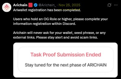 AriChain上市日期的一大隐患是缺乏官方沟通。该项目的主X账户自2025年11月以来一直处于非活跃状态。目前仍未公布已确认的代币发行日期、交易所合作伙伴、预售记录或详细的代币经济模型。