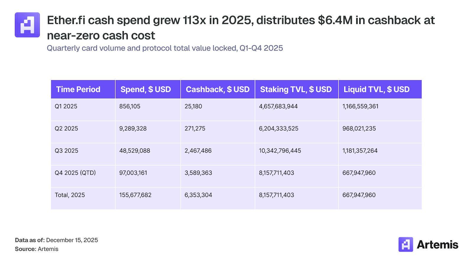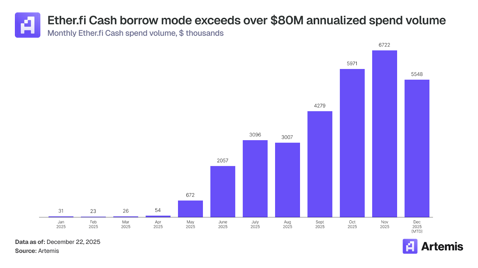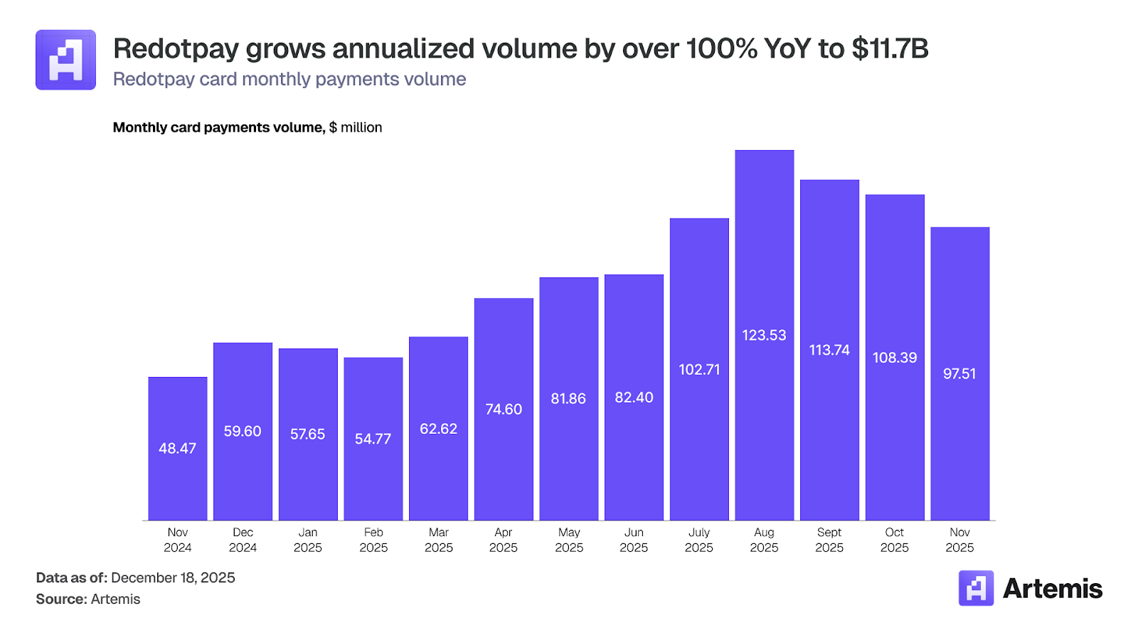 作者:Patrick, Artemis加密卡让用户能在传统商户处使用稳定币和加密货币进行消费,是数字支付领域增长最快的细分市场之一。其交易额从 2023 年初的每月约 1 亿美元增长到 2025 年底的超 15 亿美元,复合年增长率达 106%。按年计算,该市场规模现已超 180 亿美元,与同期仅增长 5% 的点对点(P2P)稳定币转账(190 亿美元)不相上下。