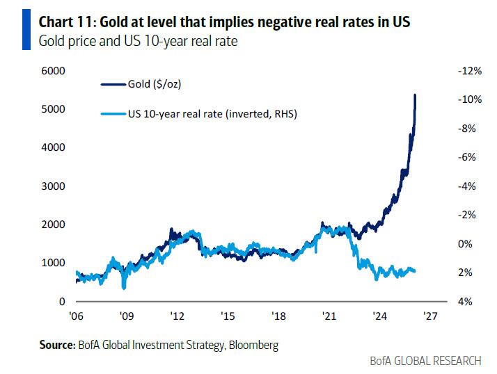 尽管黄金价格近期呈现出“泡沫化”特征,甚至在上周五经历了大幅回调,但Hartnett认为这并未改变大局。2020年代的投资趋势是由战争、通胀、保护主义和财富再分配主导的。目前,黄金的价格水平暗示美国实际利率为负,这与市场普遍预期的流动性过剩、美元贬值以及美国经济在选举前繁荣的基本情境相吻合。