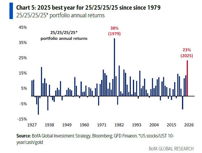 更令人瞩目的是,该组合在2025年录得了高达23%的巨额收益,这是自1979年以来表现最好的一年。