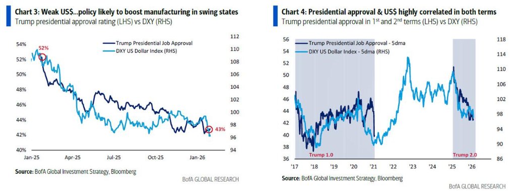 这不仅仅是经济问题,更是政治生存问题。Hartnett的数据显示,在特朗普的第一和第二任期内,总统的支持率与美元走势呈现高度的相关性。