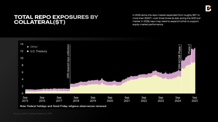 随着推高市场所需的流动性要求增加,银行系统显现压力。为了在不引发股市抛售(白宫无法接受的路径)的前提下维持高估值,市场极度依赖回购市场(Repo)输血。 仅在 2025 年,回购市场规模就从约 6 万亿美元激增至 12.6 万亿美元 以上 — — 是 2021 年牛市期间的三倍多。2026 年,回购市场可能需进一步扩张以支撑股市。