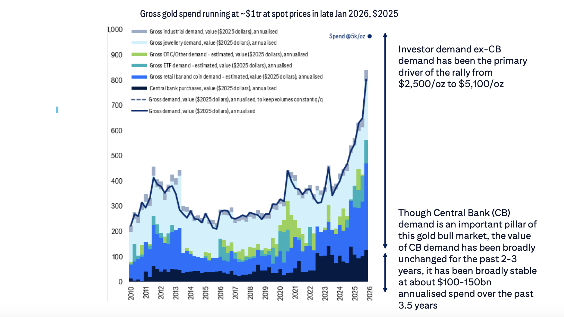据花旗报告:本轮从2500美元/盎司上涨到5100美元/盎司的过程中,驱动因素主要是“剔除央行后的投资者需求”。