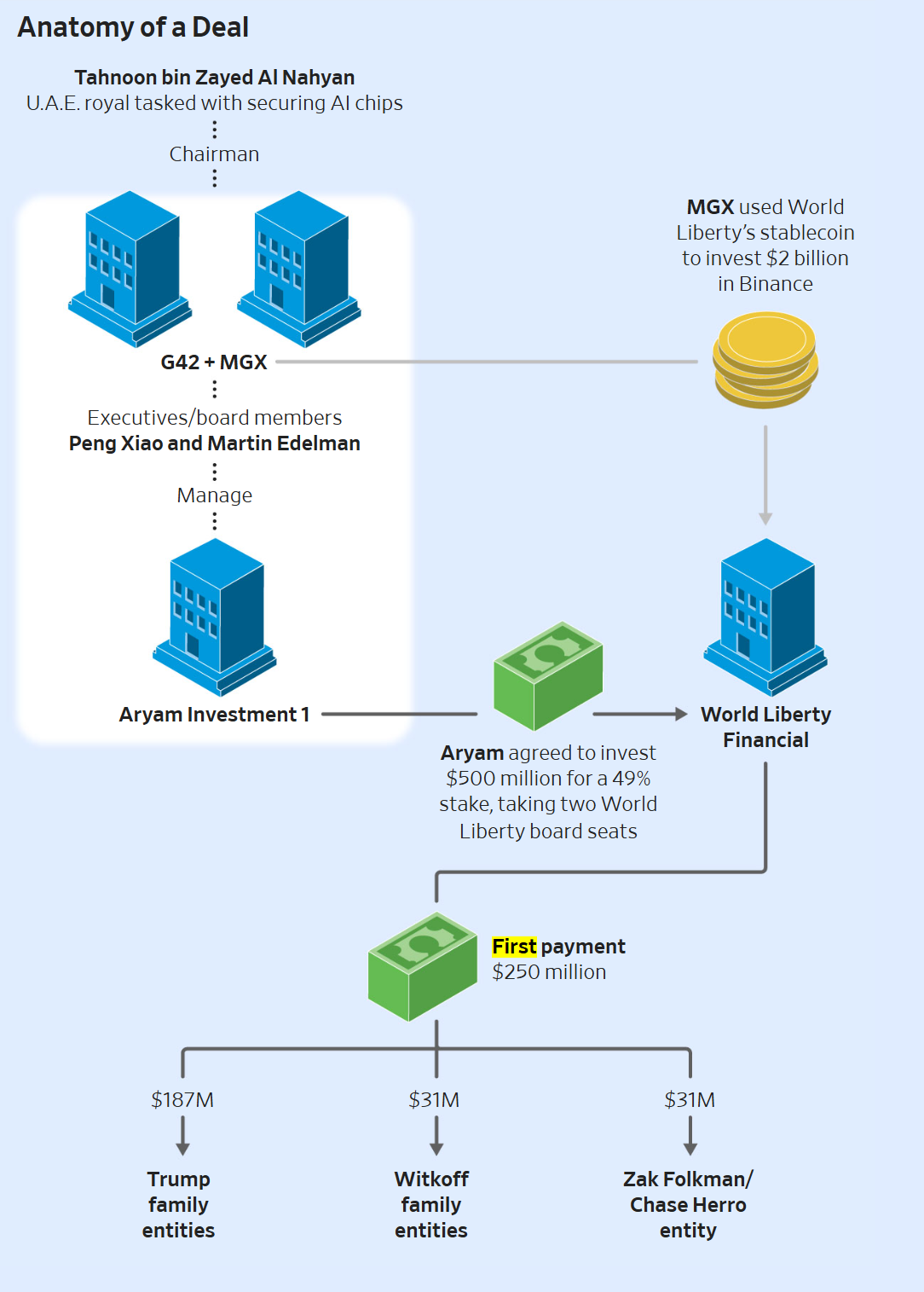 《华尔街日报》援引文件及知情人士称,阿布扎比实体Aryam Investment 1,由谢赫Tahnoon bin Zayed Al Nahyan支持,于2025年1月签署协议,以5亿美元购买World Liberty Financial 49%股权。