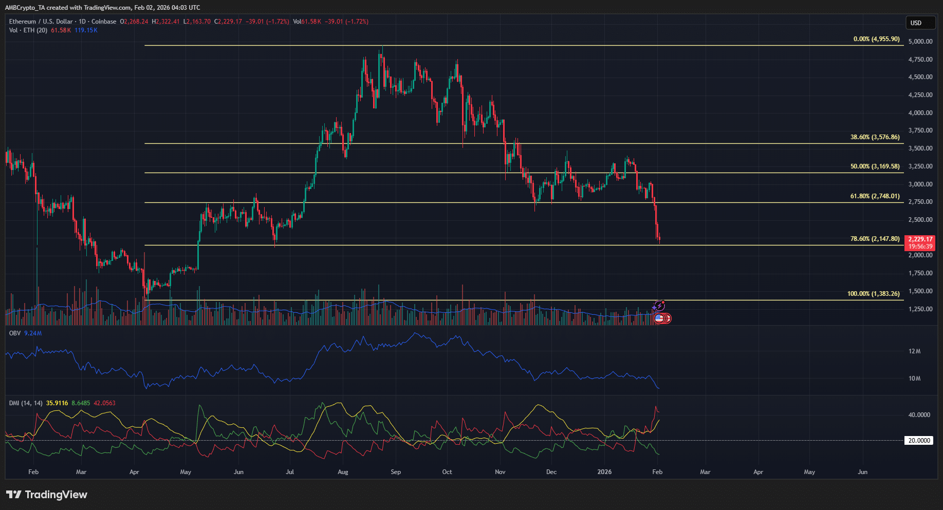 以太坊周末遭遇重创,价格较周六(1 月 31 日)开盘价 2,702 美元下跌了 17.38%。