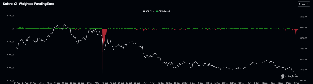 Solana的衍生品数据显示,其前景看跌。Coinglass的未平仓合约加权融资率数据显示,押注SOL价格将进一步下跌的交易者数量高于预期价格上涨的交易者数量。