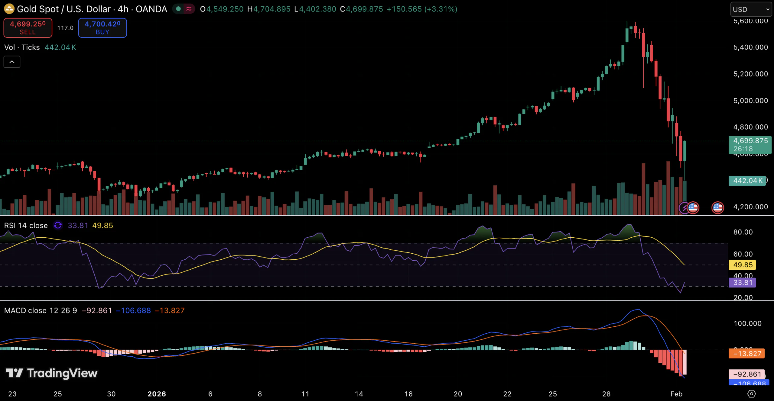 “>MACD各项指标证实下行势头强劲,目前尚未出现明显的反转信号。现货金价跌至每盎司约4692美元,过去三个交易日累计跌幅接近每盎司1000美元。贵金属价格也受到波及,白银、股票和加密货币均同步下跌。