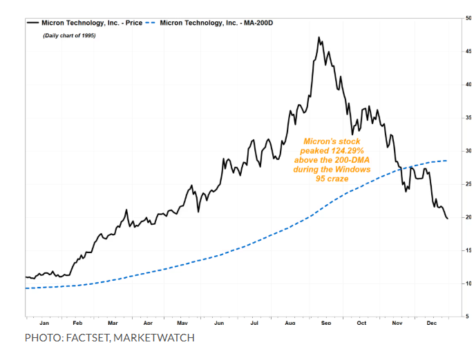 此前的纪录出现在1995年9月11日,当时偏离度为124%。彼时美光股价因微软发布Windows 95而飙升,新操作系统引发存储芯片强劲需求,导致供应短缺并推高价格和利润——这一场景与当前AI热潮高度相似。那次峰值过后三个月,股价下跌42%;12个月后暴跌77%。