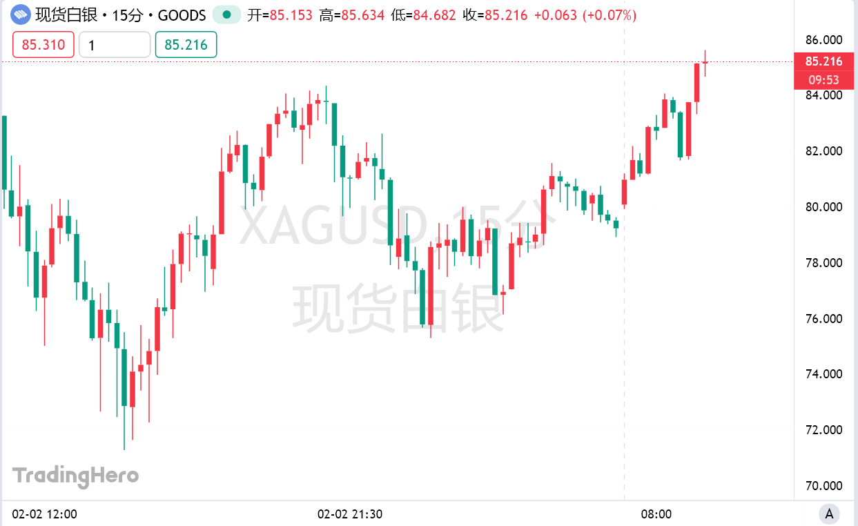周二截至发稿,现货白银站上85美元/盎司,日内涨7.27%。纽约期银向上触及85美元/盎司,日内涨10.38%。