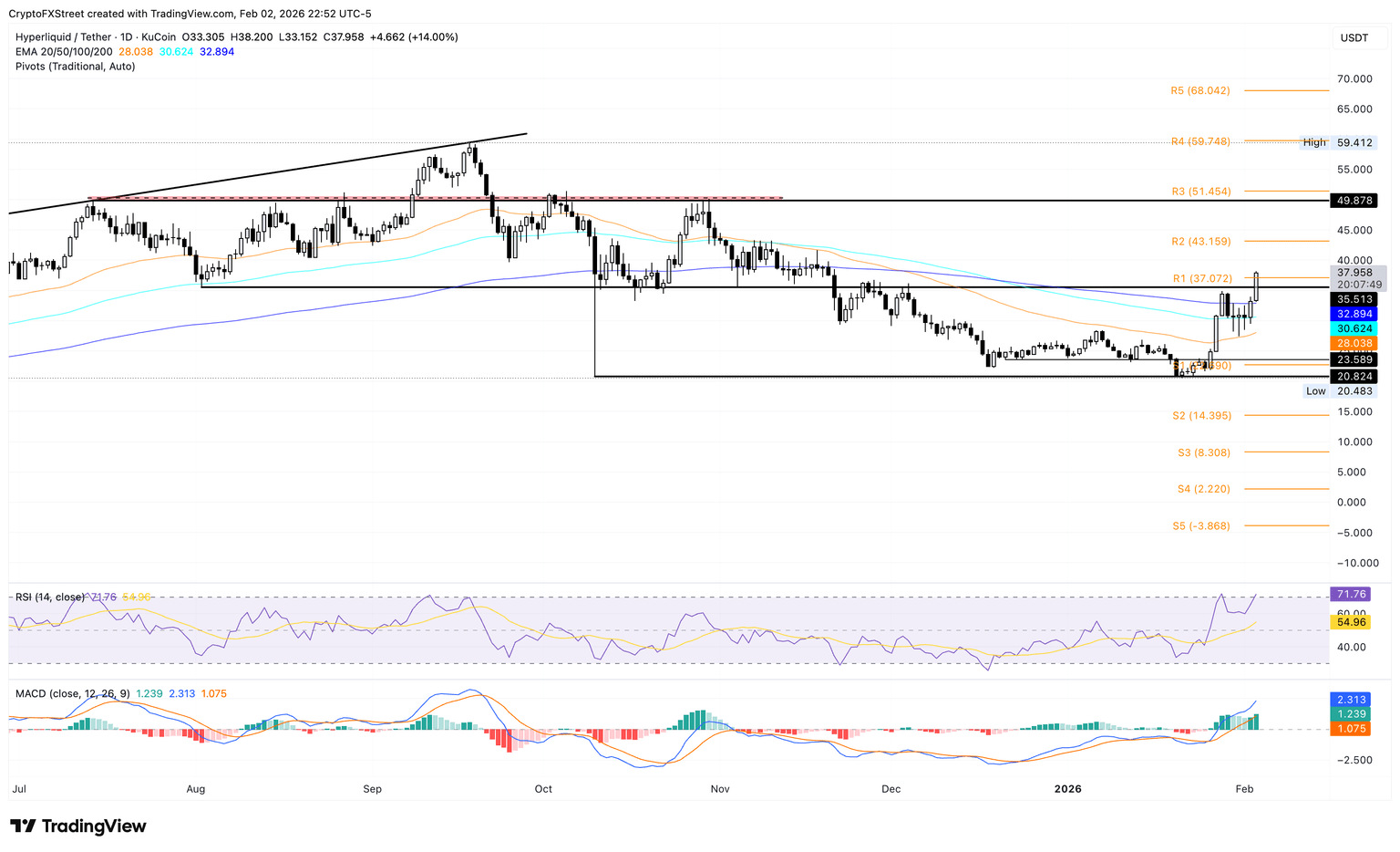 从下行角度来看,如果 HYPE 未能守住 200 日均线 32.89 美元上方,则进一步上涨的机会将消失,并可能导致其重新测试 100 日均线 30.62 美元和 50 日均线 28.03 美元。