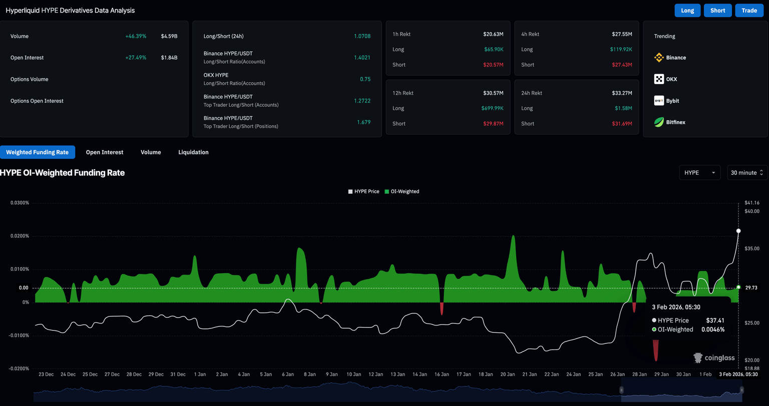 CoinGlass数据显示,HYPE期货未平仓合约(OI)在过去24小时内飙升27%至18.4亿美元,表明资金大量流入。通常情况下,在上涨趋势中期货市场出现如此大规模的资金流入,表明交易者普遍看涨。