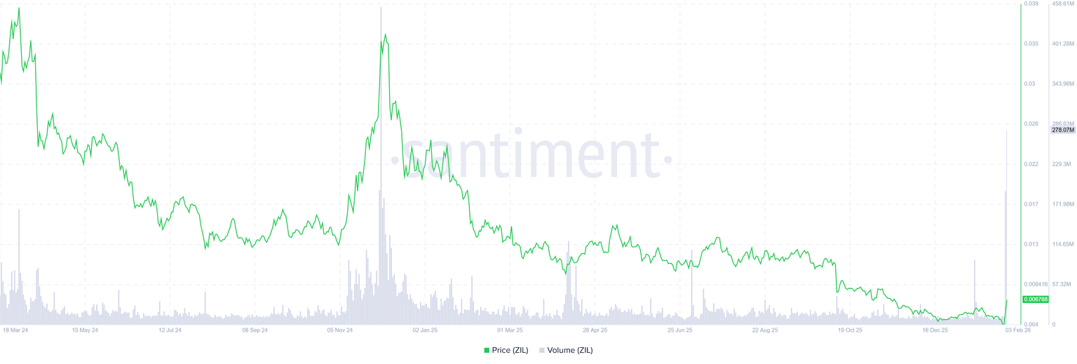 Santiment 数据显示,Zilliqa 生态系统的交易量(链上所有交易应用程序产生的总交易量)周二达到 2.7807 亿美元,创下自 2024 年 12 月以来的最高纪录。交易量的增长表明交易者的兴趣激增。流动性Zilliqa 的上涨提振了其看涨前景。