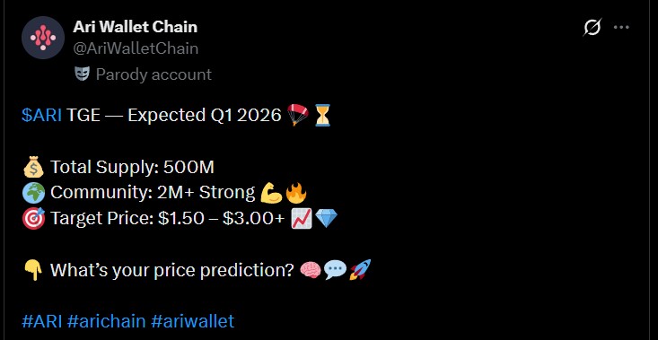 该社区规模相当庞大,拥有超过 63.7 万 X 粉丝和 48.5 万 Telegram 成员,但目前尚无官方频道。尽管一些恶搞账号和粉丝账号仍在发布可能的代币抽奖 (TGE) 日期和 AriChain 代币价格预估,但这些信息尚未得到证实。