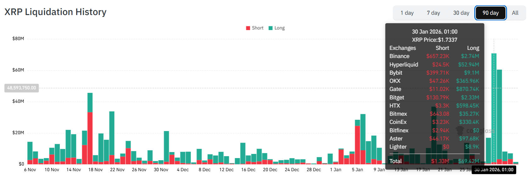 具体来说,关于一月30,长期清算总计6942万美元,是自……以来的最高数字。十月10次崩溃。相比之下,空头头寸仅价值133万美元。面临清算. 第二天,一月31日,市场多头平仓额达到5714万美元,创下年度新高,仅次于……1月30日数据.