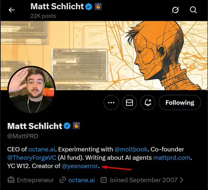 Moltbook 的创建者 MattPRD,曾创建过一个结合人工智能代理 (AI Agents) 和去中心化科学 (DeSci) 的双赛道项目 Yesnoerror,而这个项目还曾发过代币$YN,市值最高曾达到 1.2 亿美元。