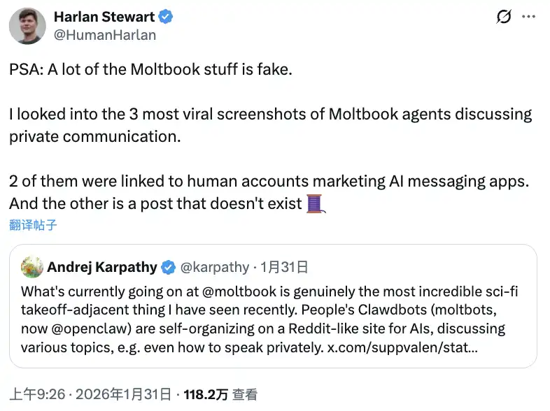 研究人员们越挖越深,更多曝光出现了,Harlan Stewart 调查发现,三张最病毒式传播的和「Moltbook 对话」截图中,两个链接到人类账号推广 AI 通讯应用(如 Claude Connection),另一个帖子根本不存在。