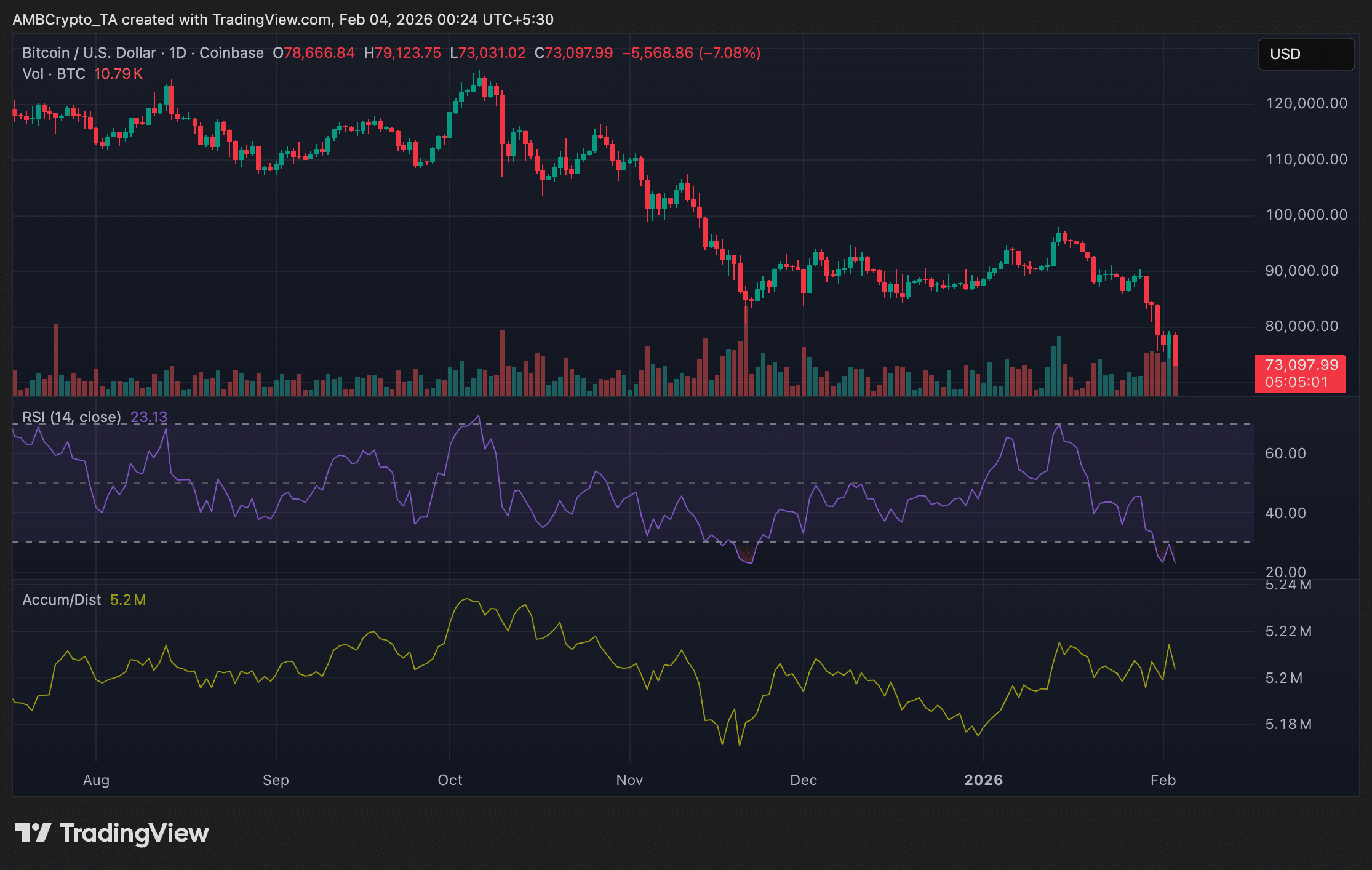 根据 TradingView 的数据,比特币跌至约73,000 美元单日亏损超过7%这一走势果断地跌破了……8万美元左右1 月份支撑价格走势的支撑区域,为更深层次的下行测试打开了大门。