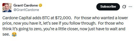 在加密货币市场承压之际,卡多内资本非但没有撤离,反而买入了比特币。格兰特·卡多内证实他的公司在比特币价格约为 72,000 美元时增持了更多比特币,在市场恐慌情绪蔓延之际采取了大胆举措。