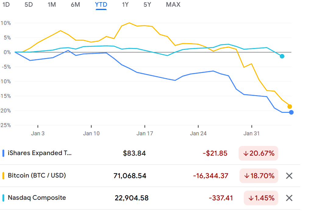 软件ETF掉落2 月 4 日,比特币下跌约 1.8%,而以科技股为主的纳斯达克指数也下跌 1.5%,拖累比特币下跌近 3%。