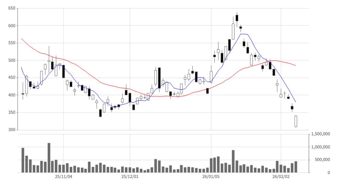 Metaplanet自1月中旬以来股价持续下跌。来源:日本交易所集团