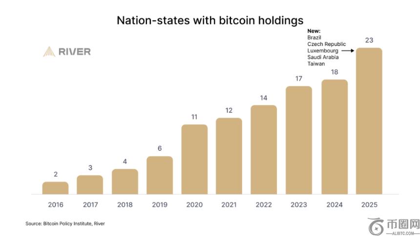 2025年,又有5个国家成为比特币持有者,包括2家主权财富基金(卢森堡、沙特阿拉伯)和1家央行(捷克央行)。