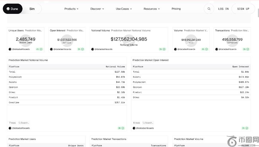 截至2026年2月,预测市场全行业Notional Volume总计$1275亿,实际Volume $699亿,独立用户数249万,未平仓合约突破$10亿。