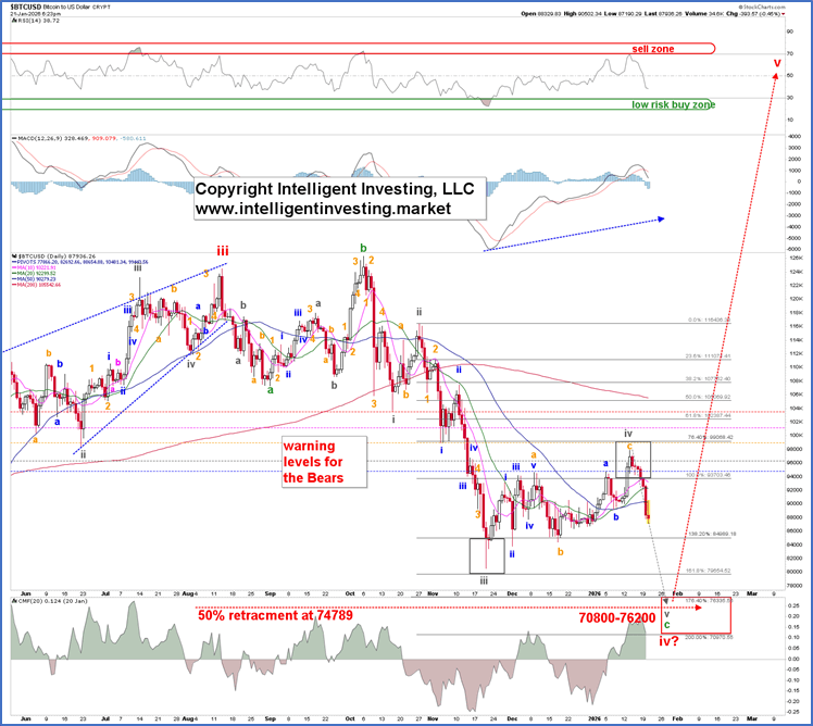 这些观察结果至关重要,因为它们为当前局势和未来走势奠定了基础。时间快进到今天。比特币在1月13日突破了94,617美元的关口,但仅维持了四天,目前价格约为88,000美元。这是一次假突破,否定了我们之前追踪的可能上涨趋势。与此同时,第三个预警位已被突破,这意味着上涨趋势结束的概率为60%。因此,我们将备选的看跌艾略特波浪理论(EW)计数方法切换为主要预期。请参见下图1。