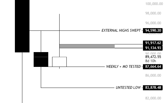 第二种情景是,比特币本月收盘价接近目前的 89,000 美元左右,随后在 2 月初向 91,000 美元至 92,000 美元区间寻求流动性,之后恢复下跌趋势。有趣的是,这两种情景都符合市场可能先上涨以重新平衡流动性,然后再下跌的观点。