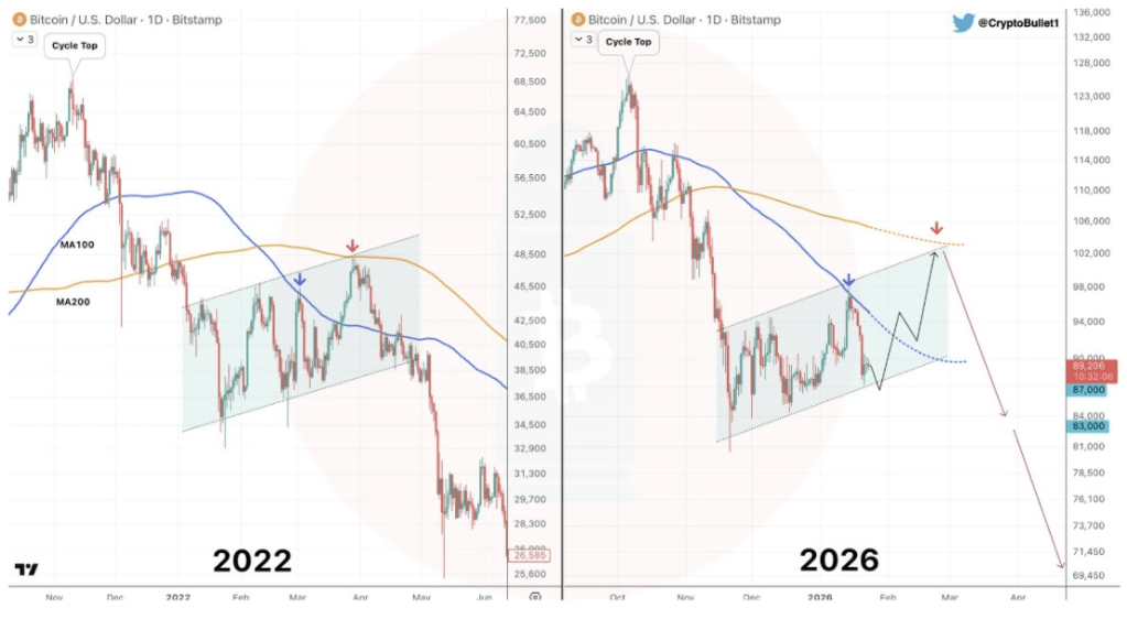 在他的技术分析中发布Crypto Bullet 在 X 网站上指出,比特币目前正在重演 2022 年的走势,这可能导致其价值下跌超过 20%。为了佐证其看跌观点,该分析师展示了一张对比图表,比较了比特币在 2022-2023 年和 2025-2026 年的价格走势,并着重强调了相似的技术形态、价格行为和移动平均线 (MA)。
