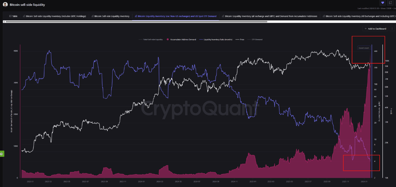 第二个指标,即流动性库存比率(月度),也进一步印证了 CoinNiel 的看涨观点。该指标追踪并比较交易所现有的比特币需求与供应量,从而显示需求是否会超过供应量。可用供应.
