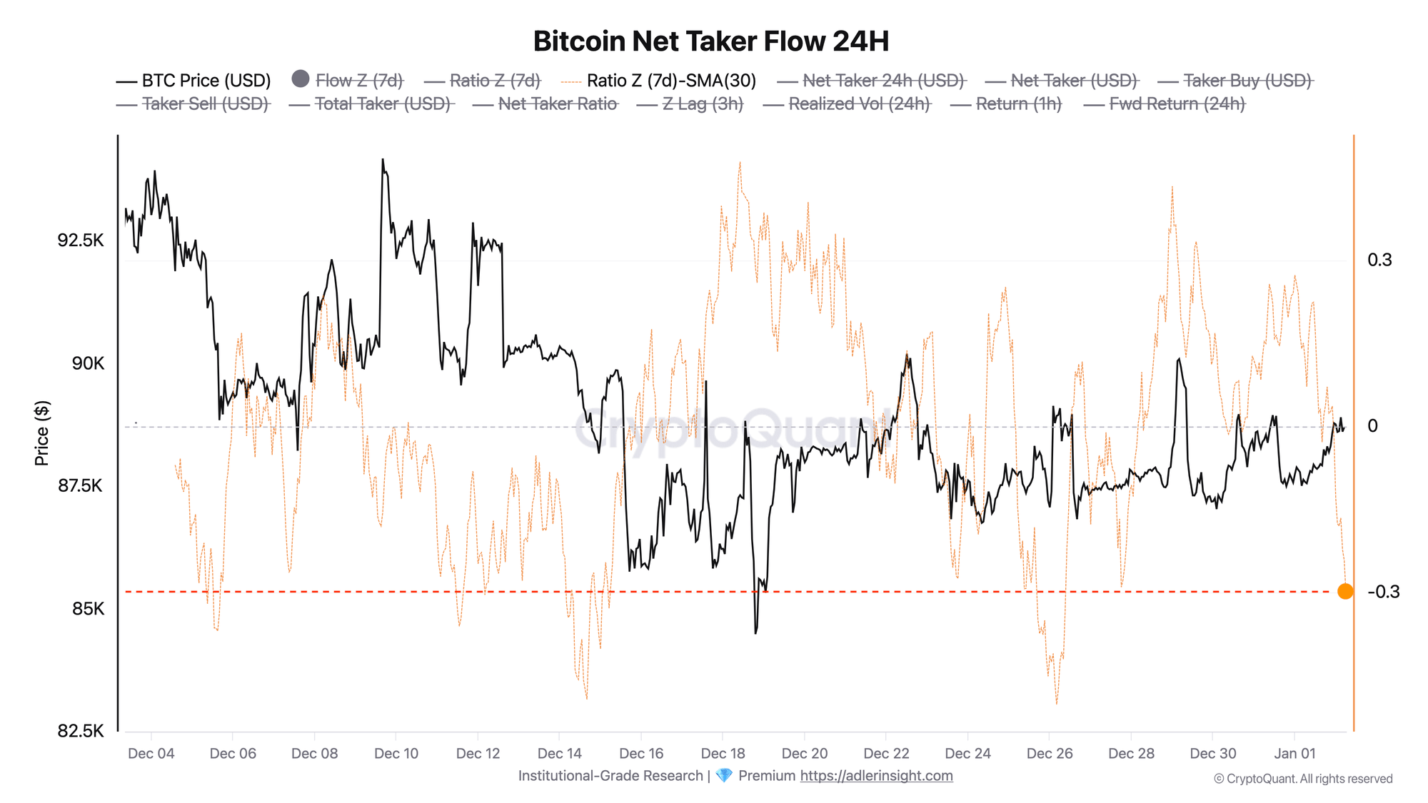 这种一致性至关重要。当累积压力和短期动能同时减弱时,市场走势受噪音或孤立仓位驱动的可能性就会降低。相反,这表明交易者的整体激进情绪正在向卖方倾斜。阿德勒指出,如果动能持续减弱,尤其是当相关指标跌破-0.4阈值时,下行风险将会进一步加剧。