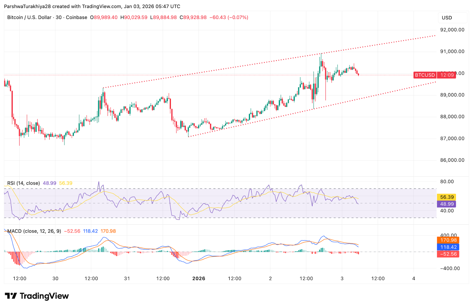 相对强弱指数 (RSI) 接近 49,反映出市场处于中性状态,而非强劲的上涨势头。移动平均收敛/发散指标 (MACD) 已转为小幅负值,表明在 12 月下旬冲击 91,000 美元之后,上涨动能迅速消退。
