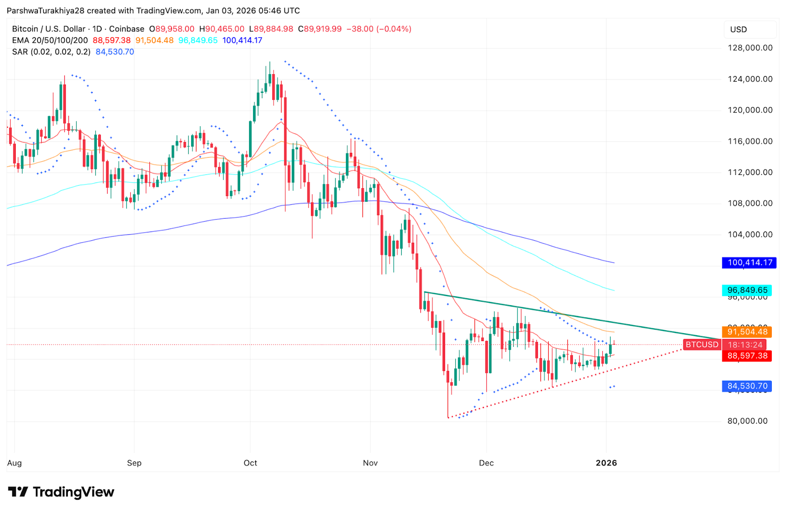 比特币价格今日在 89,950 美元附近交易,1 月份开盘后,市场仍被一条下降趋势线所限制,该趋势线自 11 月中旬以来就阻碍了每一次反弹。这种结构反映的是企稳而非复苏,卖方仍然掌控着高时间框架的交易,而买方则难以重拾失去的动能。