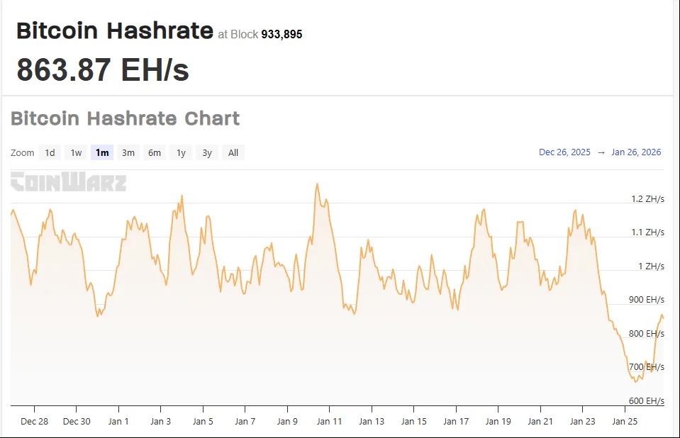 根据 Mining Pool Stats 汇编的数据,衡量代币铸造算力的关键指标——哈希率——出现了大幅下降。这主要是由于主要服务于美国运营商的矿池 FoundryUSA 和 Luxor 的算力下降所致。这两个矿池的哈希率在周末期间下降了超过 50%,并且由于冬季风暴持续对电网造成影响,目前仍处于相对较低的水平。